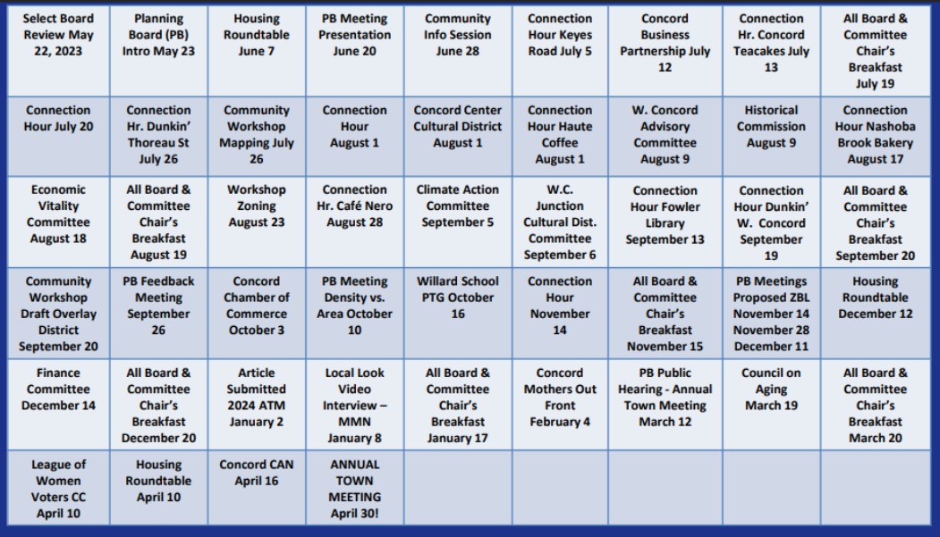 It is worth noting that this effort at incremental upzoning was incredibly staff-intensive. The implementation guidelines are highly complex; staff and citizens needed to learn the rules and choose districts and dimensional standards, out of endless possibilities. This is both an analytic challenge, and a political challenge. The planning department participated in over 50 meetings, events, and hearings, as shown in the following image: