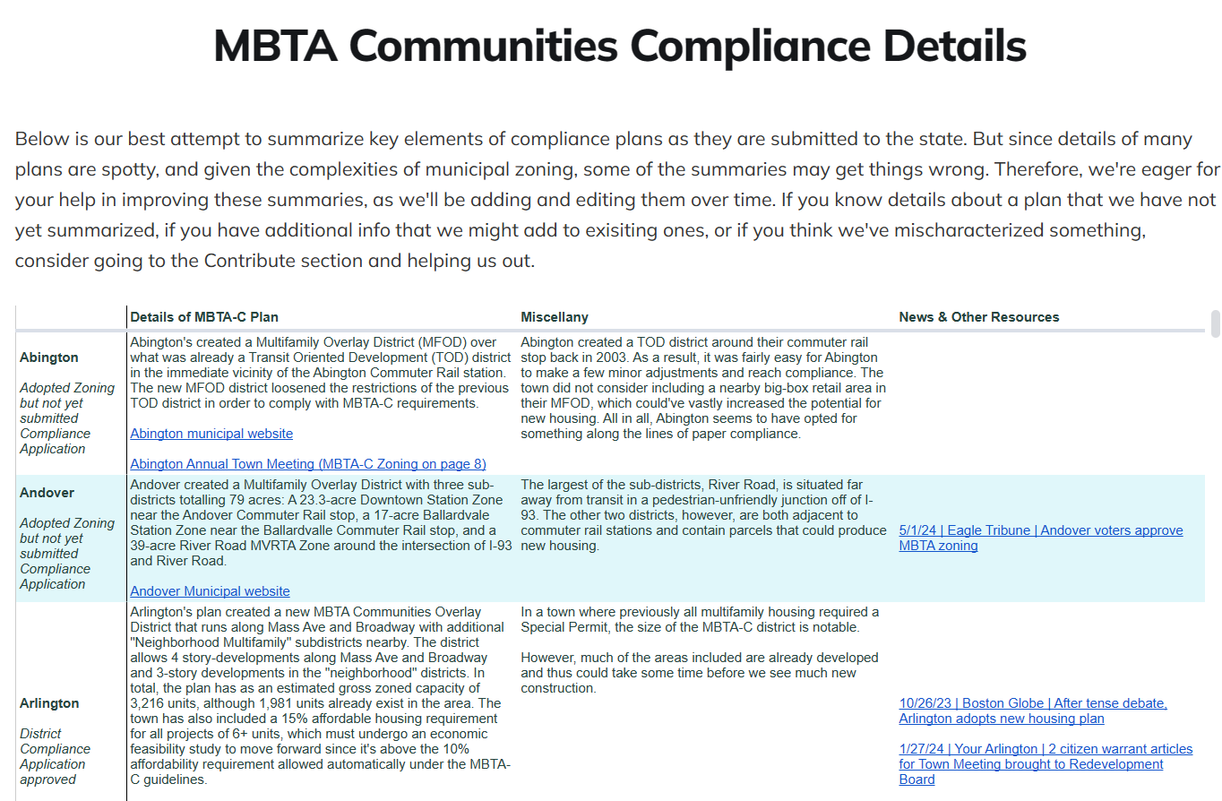 As a major part of the effort, Boston Indicators’ Lucas Munson is placing the puzzle pieces in a huge table of the 177 MBTA Communities. It includes summaries and analysis of local plans, as well as links to official documentation, PowerPoint presentations, and related news coverage. The table is a work in progress, like MBTA Communities zoning in general. Please help us fill the chart out, by sending additions, recommended edits, and your insights to upzoneupdate@bostonindicators.org or by filling out the form on the "Contribute" section of Upzone Update.
