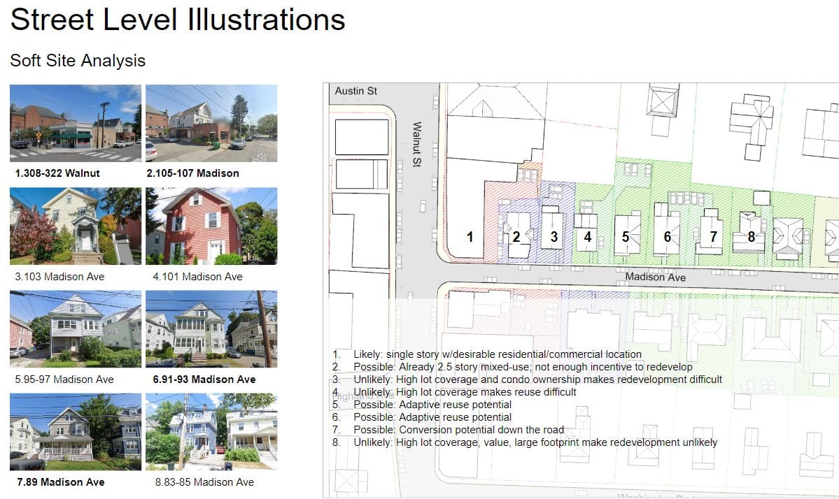 Where the new zoning for multifamily housing covers a parcel with a single-story, cheaply-built, 1950s retail box that is now sitting vacant, there is a good chance the parcel will see redevelopment. Where a parcel contains a relatively new condo building, redevelopment is highly unlikely. If municipalities want to see significant development, they can draw new zoning around parcels ready for denser redevelopment. If municipalities want to see marginal change, they can draw districts around valuable newer developments where zoning changes won’t unlock additional development potential. Many parcels represent situations between the two extremes, with varying likelihoods of redevelopment.