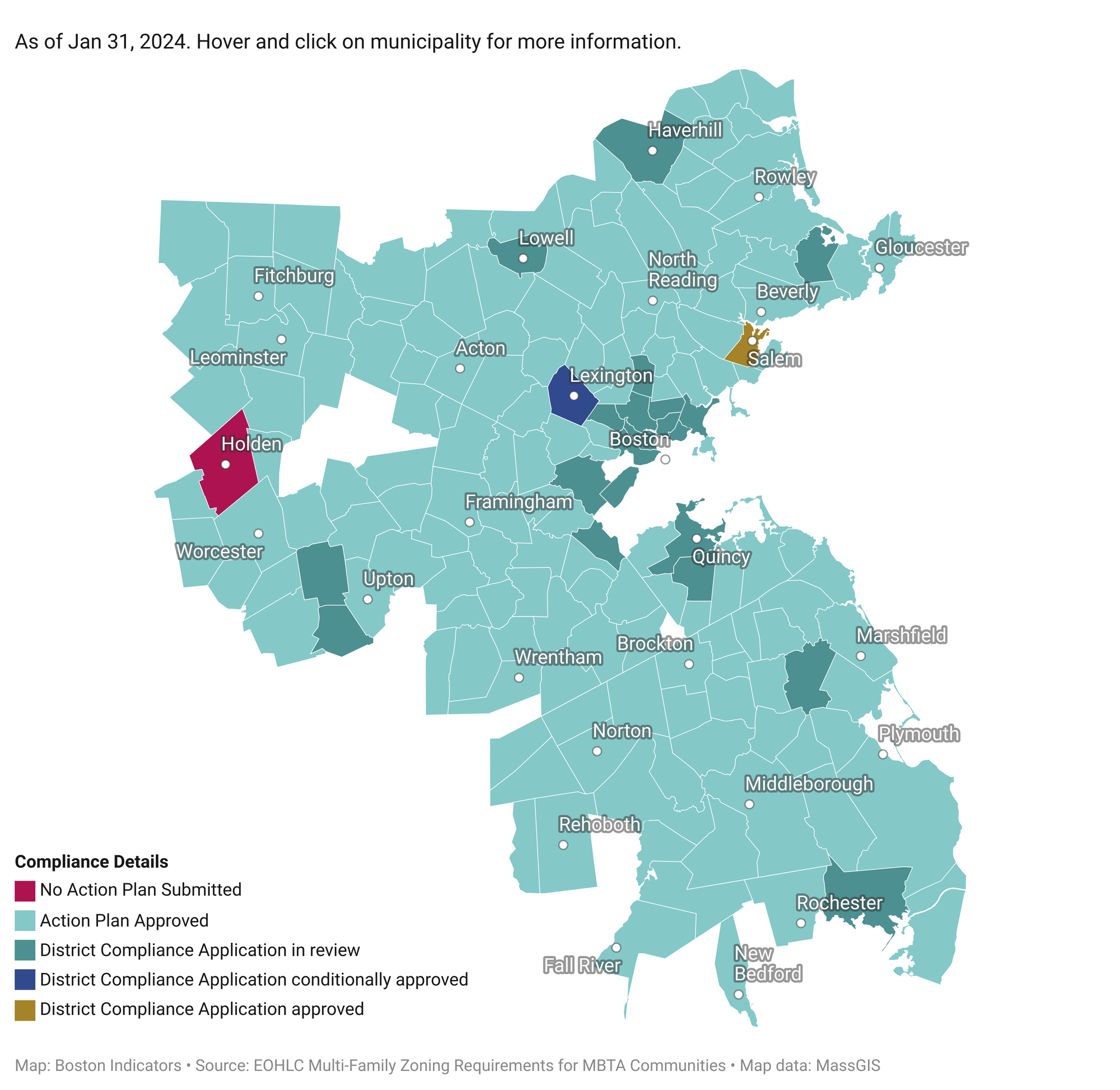 Relatedly, we have created a new interactive map on our MBTA Communities Tracker site that shows which municipalities have received determinations of compliance, or have submitted applications for determinations. It also provides some additional information, such as links to local 3A websites. We will update this map with new information over time.